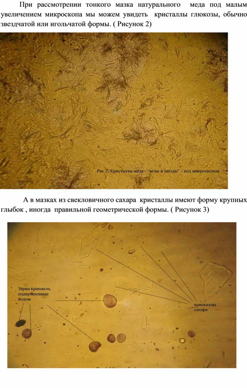 мы можем увидеть кристаллы глюкозы, обычно звездчатой или игольчатой формы. (