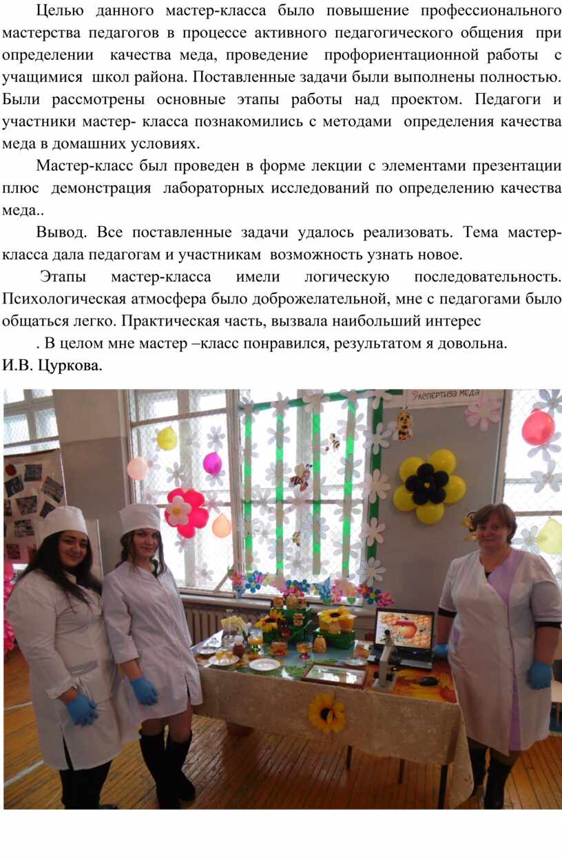 Цель мастер-класса: повышение профессионального мастерства педагогов в процессе активного педагогического общения при определении качества меда, проведение профориентационной работы с учащимися школ района.