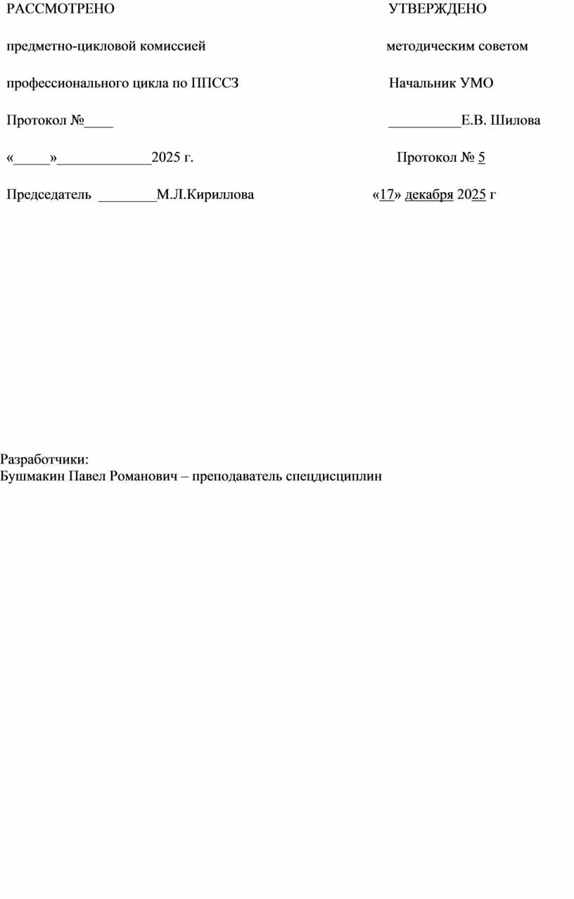 РАССМОТРЕНО предметно-цикловой комиссией профессионального цикла по ППССЗ Протокол №____ «_____»_____________2025 г. Председатель ________М.Л.Кириллова