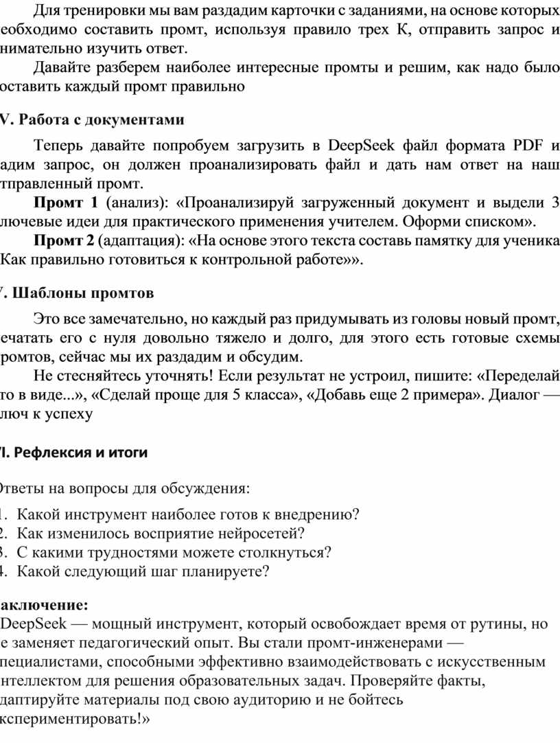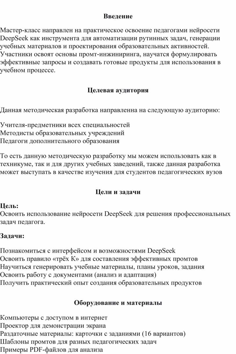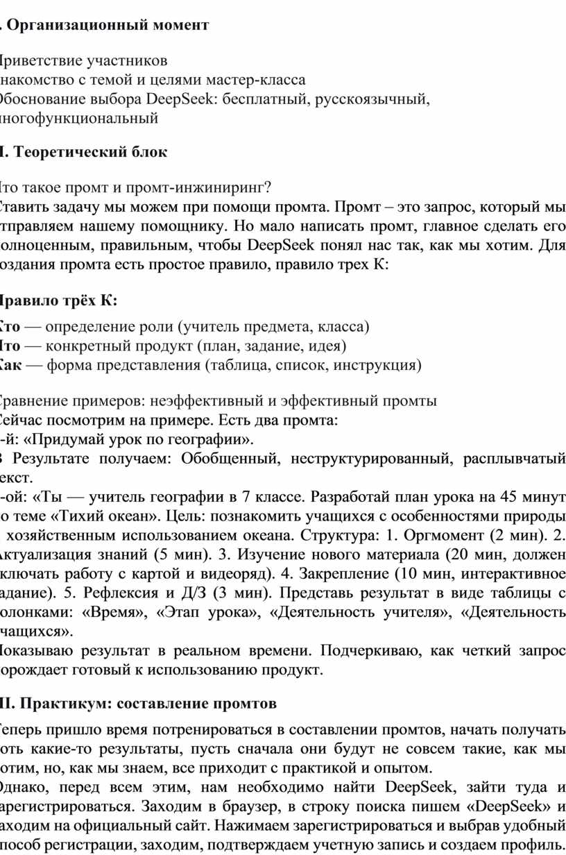Мастер-класс направлен на практическое освоение педагогами нейросети DeepSeek как инструмента для автоматизации рутинных задач, генерации учебных материалов и проектирования образовательных активностей. Участники освоят основы промт-инжиниринга, научатся формулировать эффективные запросы и создавать готовые продукты для использования в учебном процессе.