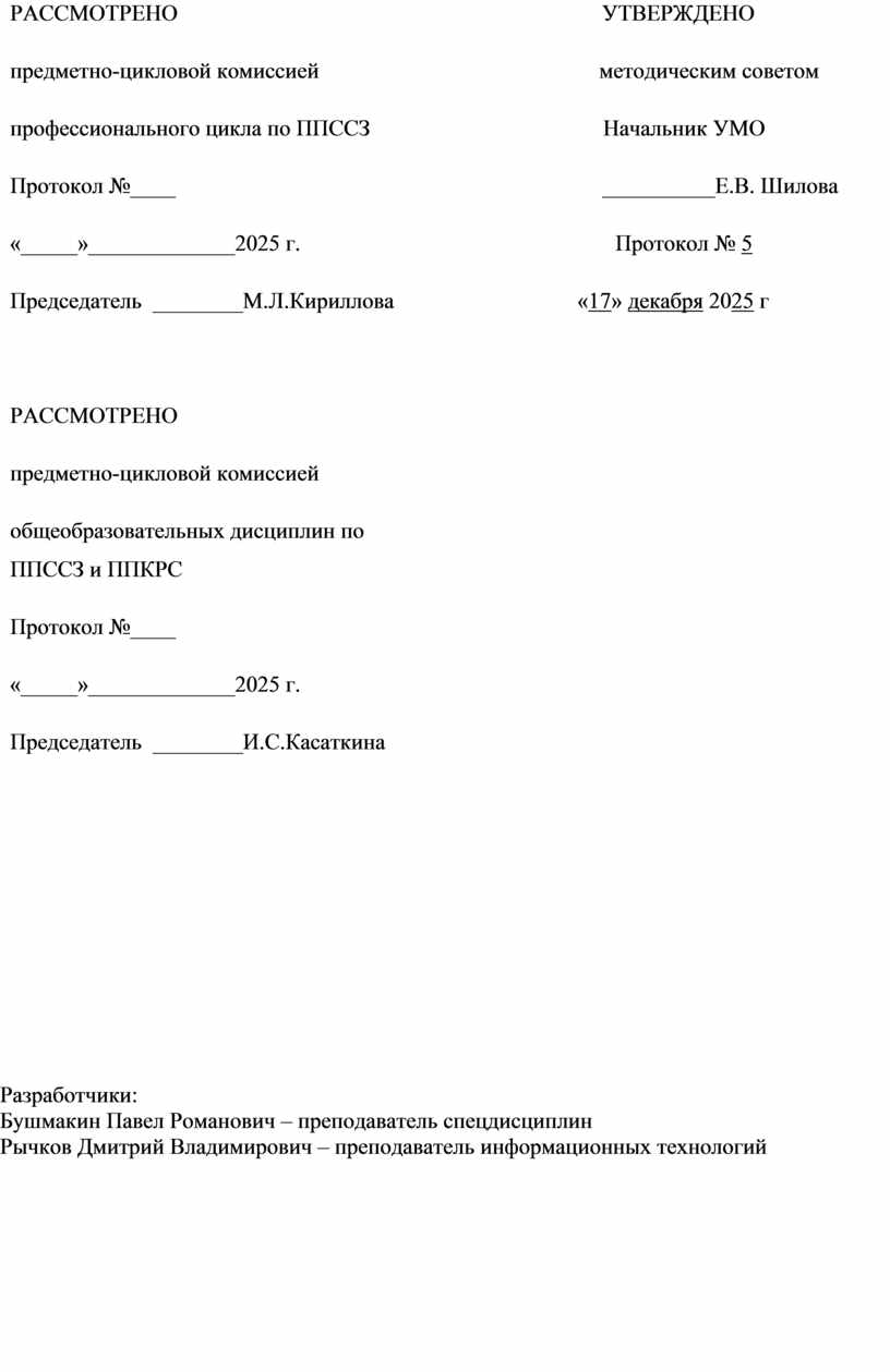 РАССМОТРЕНО предметно-цикловой комиссией профессионального цикла по ППССЗ Протокол №____ «_____»_____________2025 г. Председатель ________М.Л.Кириллова