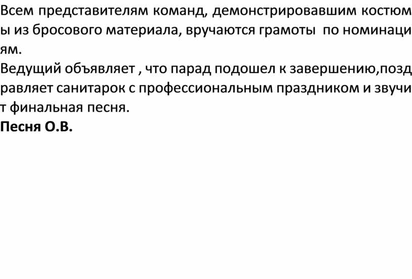 Ведущий объявляет , что парад подошел к завершению,поздравляет санитарок с профессиональным праздником и звучит финальная песня.