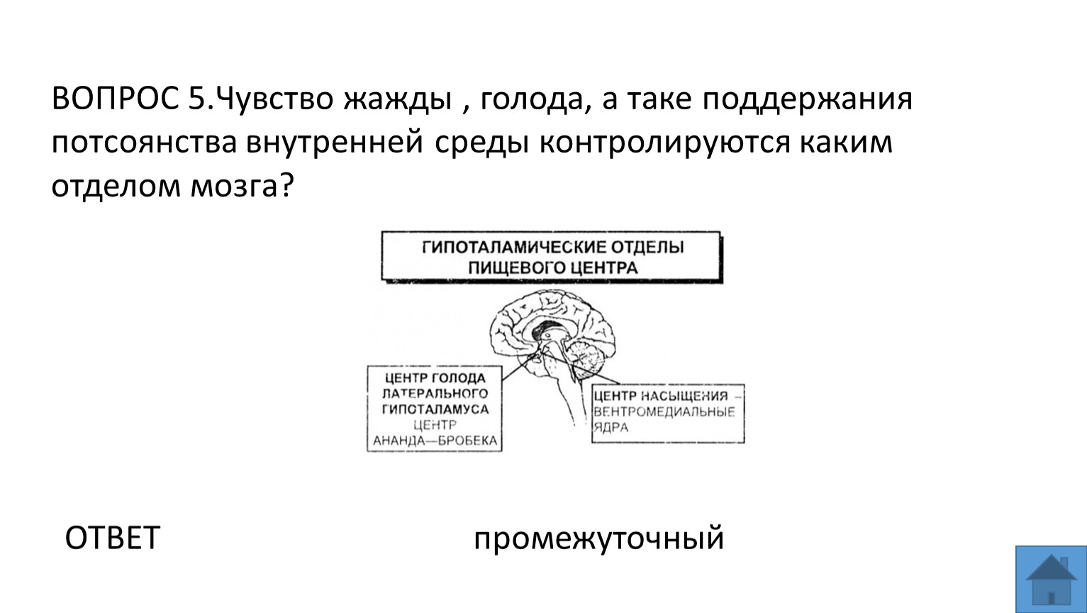 ВОПРОС 5.Чувство жажды , голода, а таке поддержания потсоянства внутренней среды контролируются каким отделом мозга?