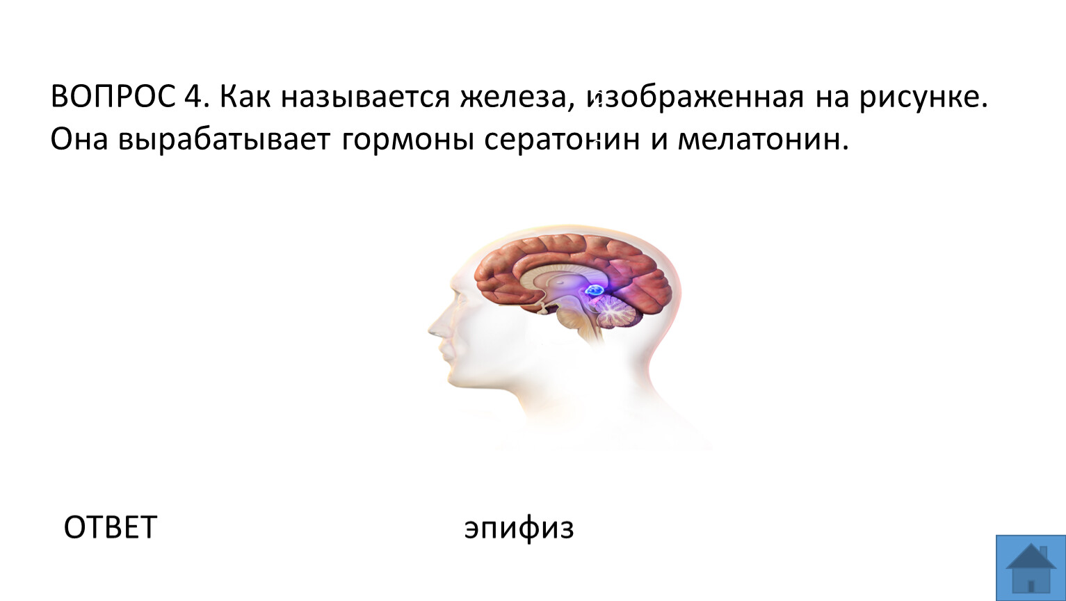 ВОПРОС 4. Как называется железа, изображенная на рисунке. Она вырабатывает гормоны сератонин и мелатонин.