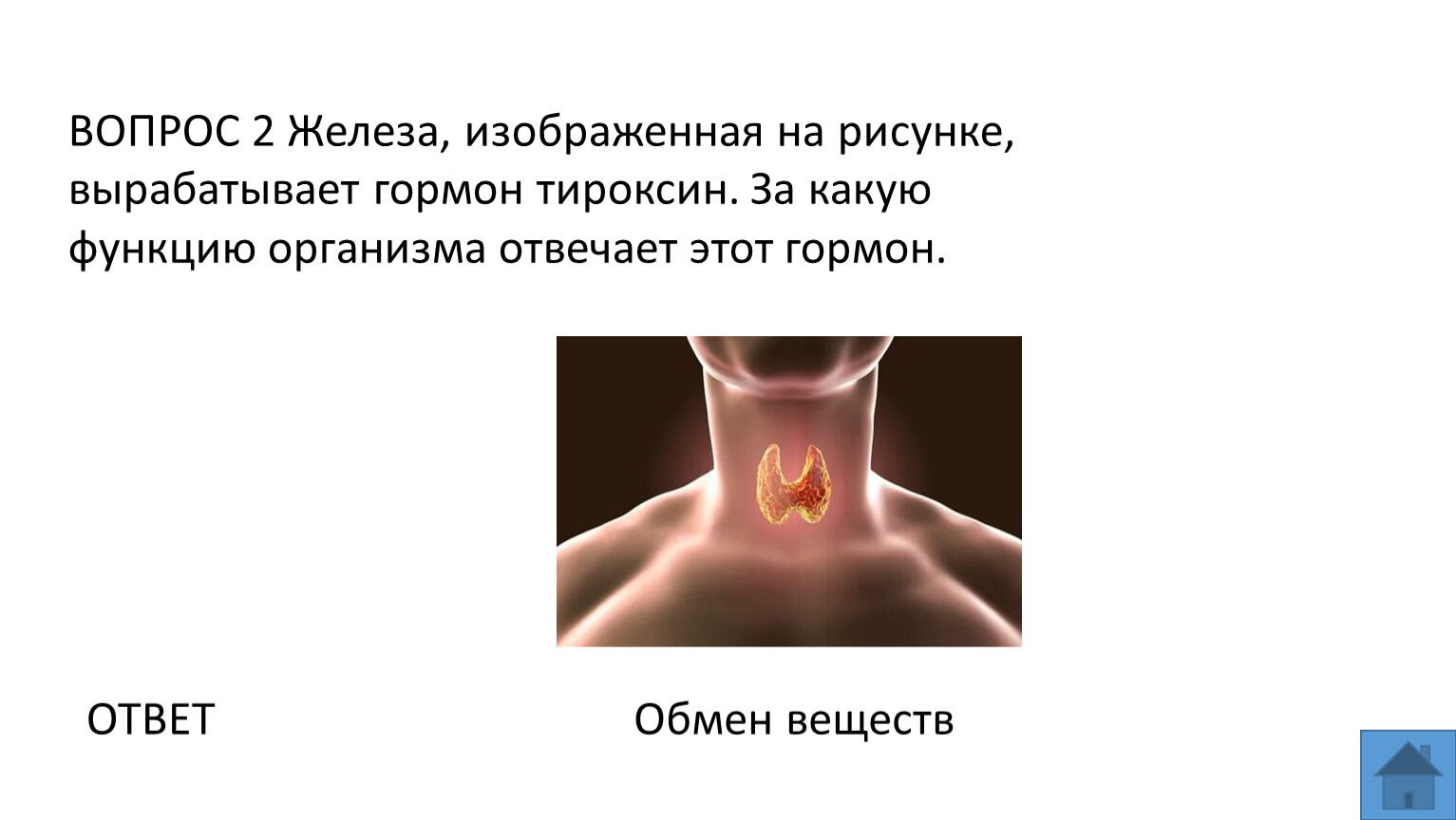 ВОПРОС 2 Железа, изображенная на рисунке, вырабатывает гормон тироксин. За какую функцию организма отвечает этот гормон.