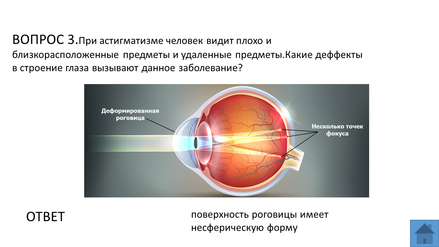 ВОПРОС 3.При астигматизме человек видит плохо и близкорасположенные предметы и удаленные предметы.Какие деффекты в строение глаза вызывают данное заболевание?