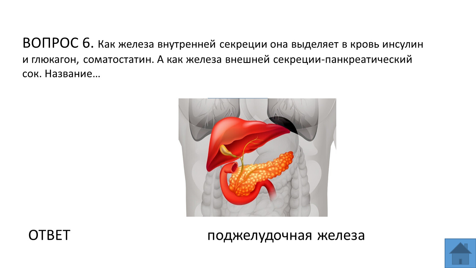 ВОПРОС 6. Как железа внутренней секреции она выделяет в кровь инсулин и глюкагон, соматостатин. А как железа внешней секреции-панкреатический сок. Название…