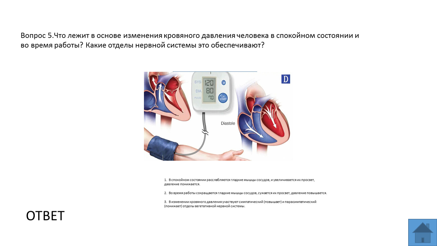 Вопрос 5.Что лежит в основе изменения кровяного давления человека в спокойном состоянии и во время работы? Какие отделы нервной системы это обеспечивают?
