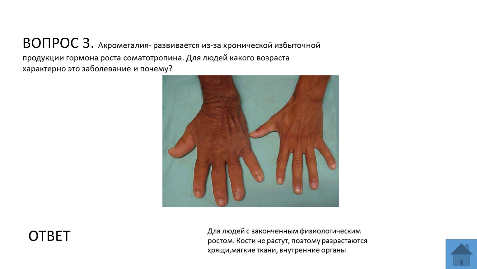 ВОПРОС 3. Акромегалия- развивается из-за хронической избыточной продукции гормона роста соматотропина. Для людей какого возраста характерно это заболевание и почему?