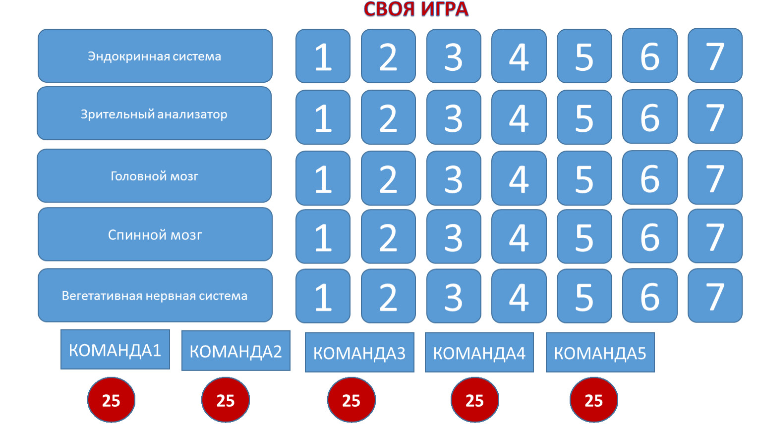 Своя игра на тему: «Строение и функции головного мозга»
