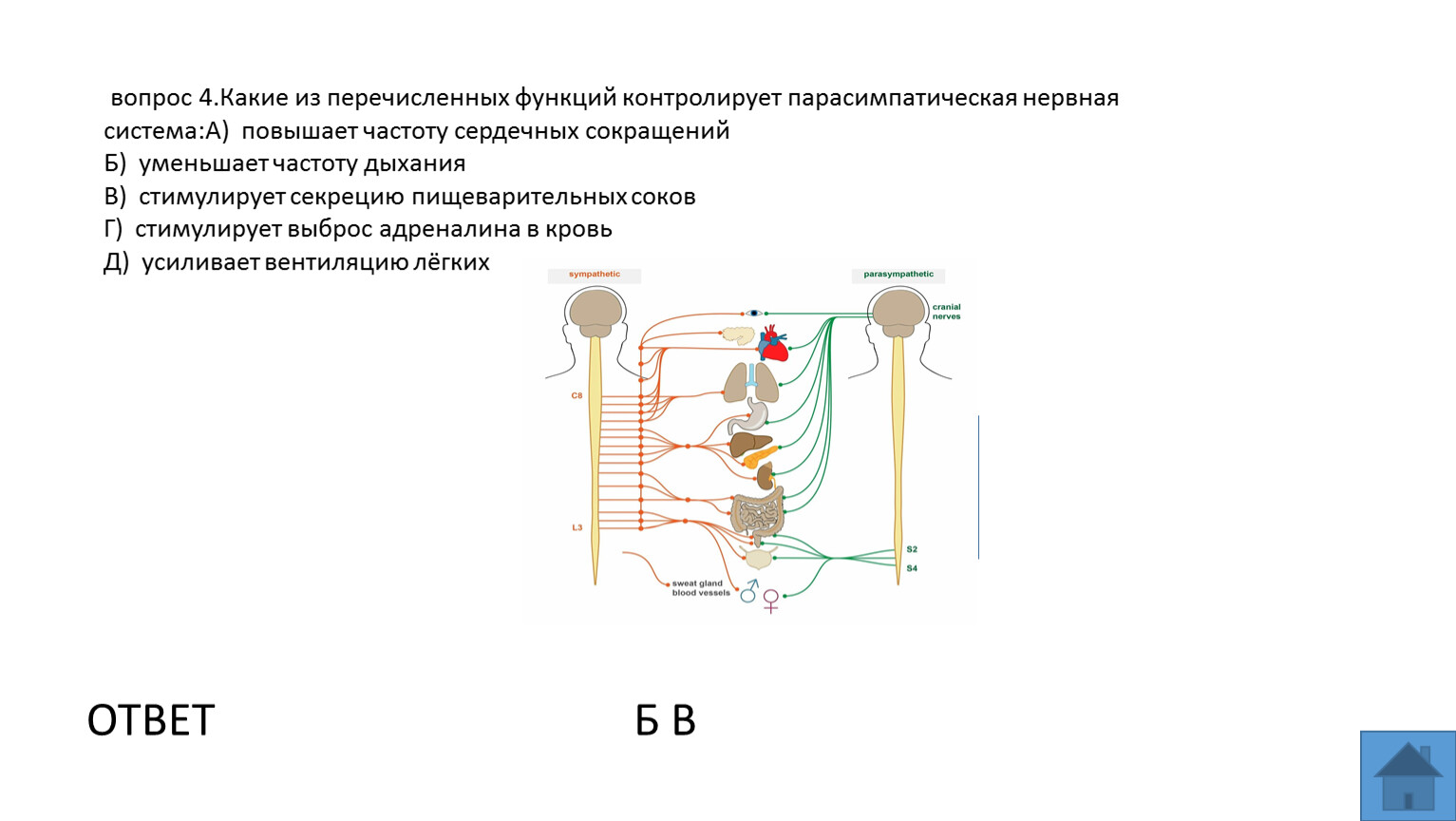 вопрос 4.Какие из перечисленных функций контролирует парасимпатическая нервная система:А) повышает частоту сердечных сокращений