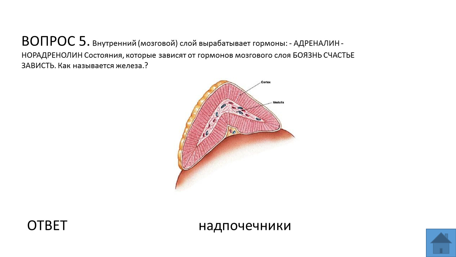 ВОПРОС 5. Внутренний (мозговой) слой вырабатывает гормоны: - АДРЕНАЛИН - НОРАДРЕНОЛИН Состояния, которые зависят от гормонов мозгового слоя БОЯЗНЬ СЧАСТЬЕ ЗАВИСТЬ. Как называется железа.?
