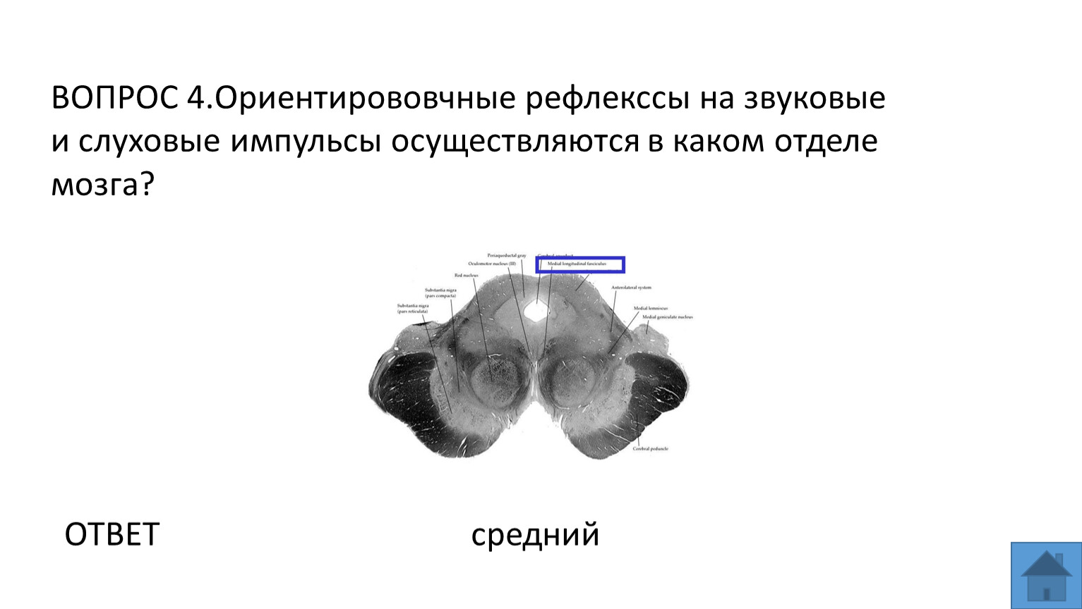 ВОПРОС 4.Ориентирововчные рефлекссы на звуковые и слуховые импульсы осуществляются в каком отделе мозга?