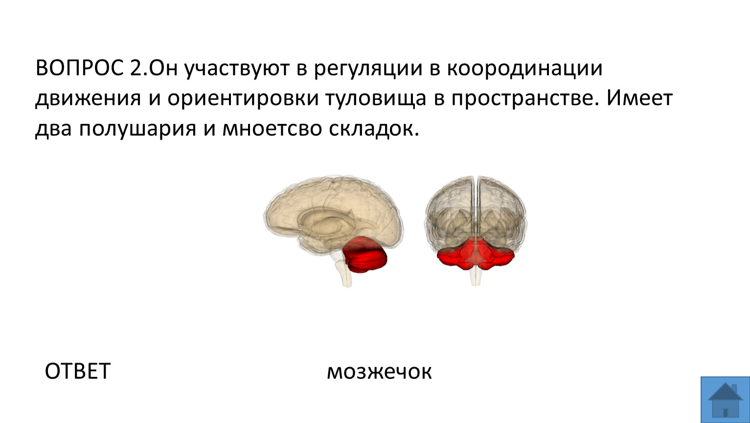 ВОПРОС 2.Он участвуют в регуляции в коородинации движения и ориентировки туловища в пространстве. Имеет два полушария и мноетсво складок.