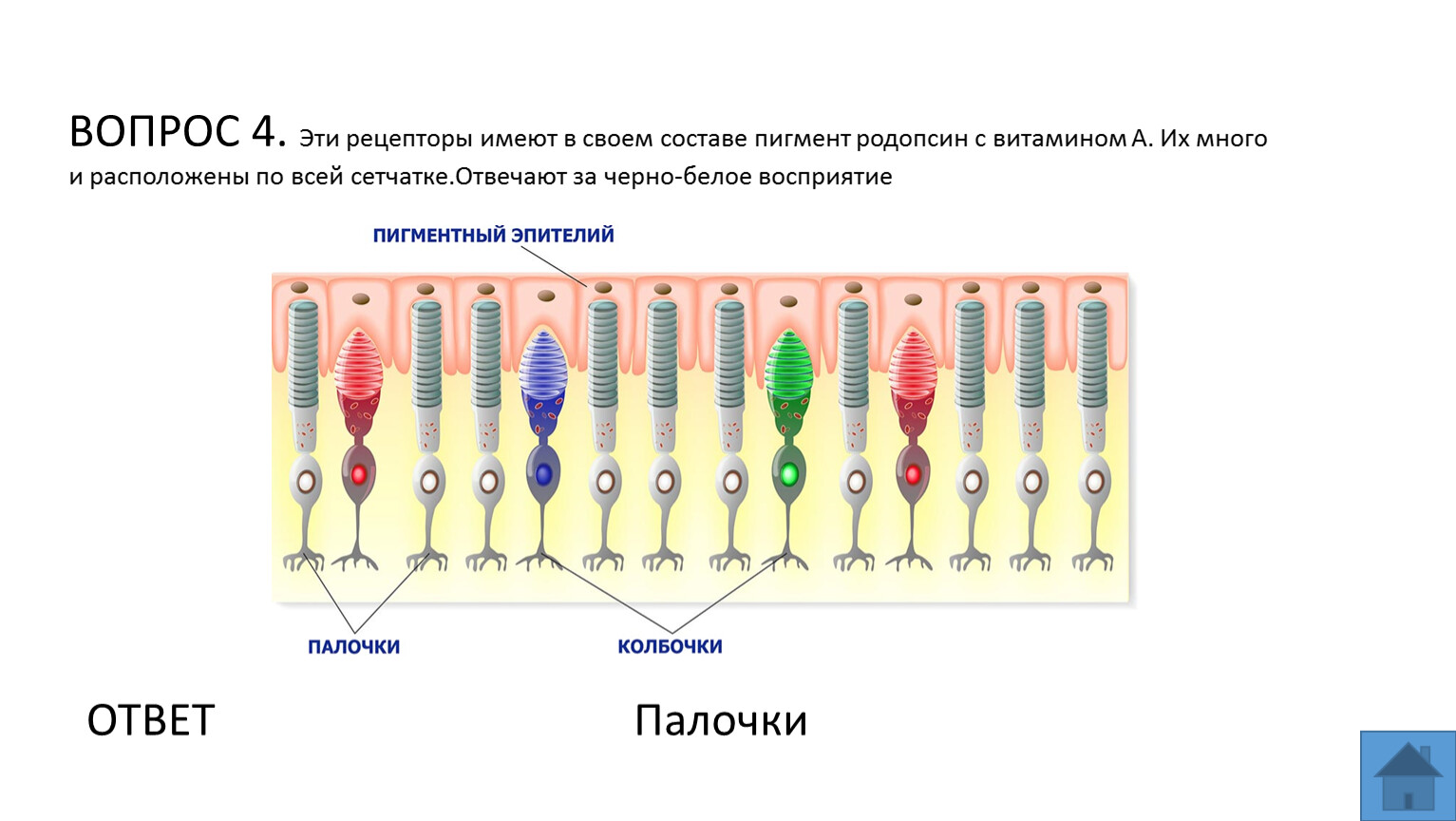 ВОПРОС 4. Эти рецепторы имеют в своем составе пигмент родопсин с витамином А. Их много и расположены по всей сетчатке.Отвечают за черно-белое восприятие