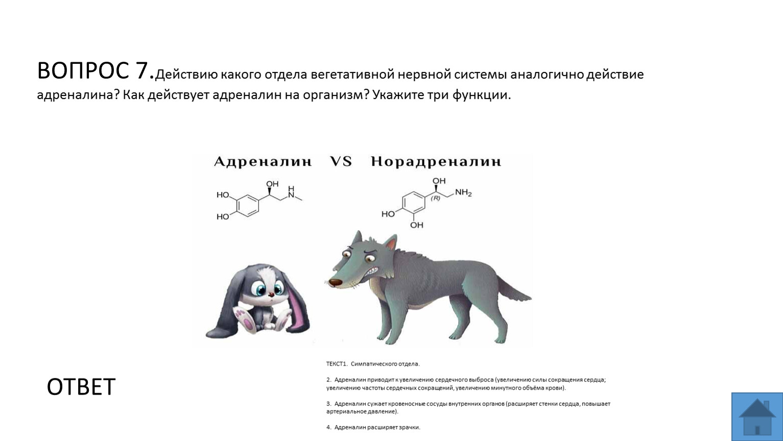 ВОПРОС 7.Действию какого отдела вегетативной нервной системы аналогично действие адреналина? Как действует адреналин на организм? Укажите три функции.