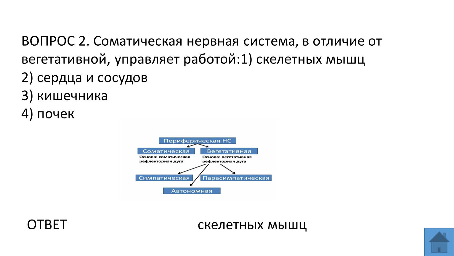 ВОПРОС 2. Соматическая нервная система, в отличие от вегетативной, управляет работой:1) скелетных мышц