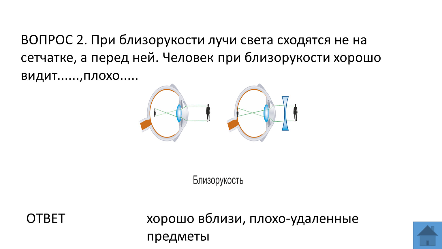 ВОПРОС 2. При близорукости лучи света сходятся не на сетчатке, а перед ней. Человек при близорукости хорошо видит......,плохо.....