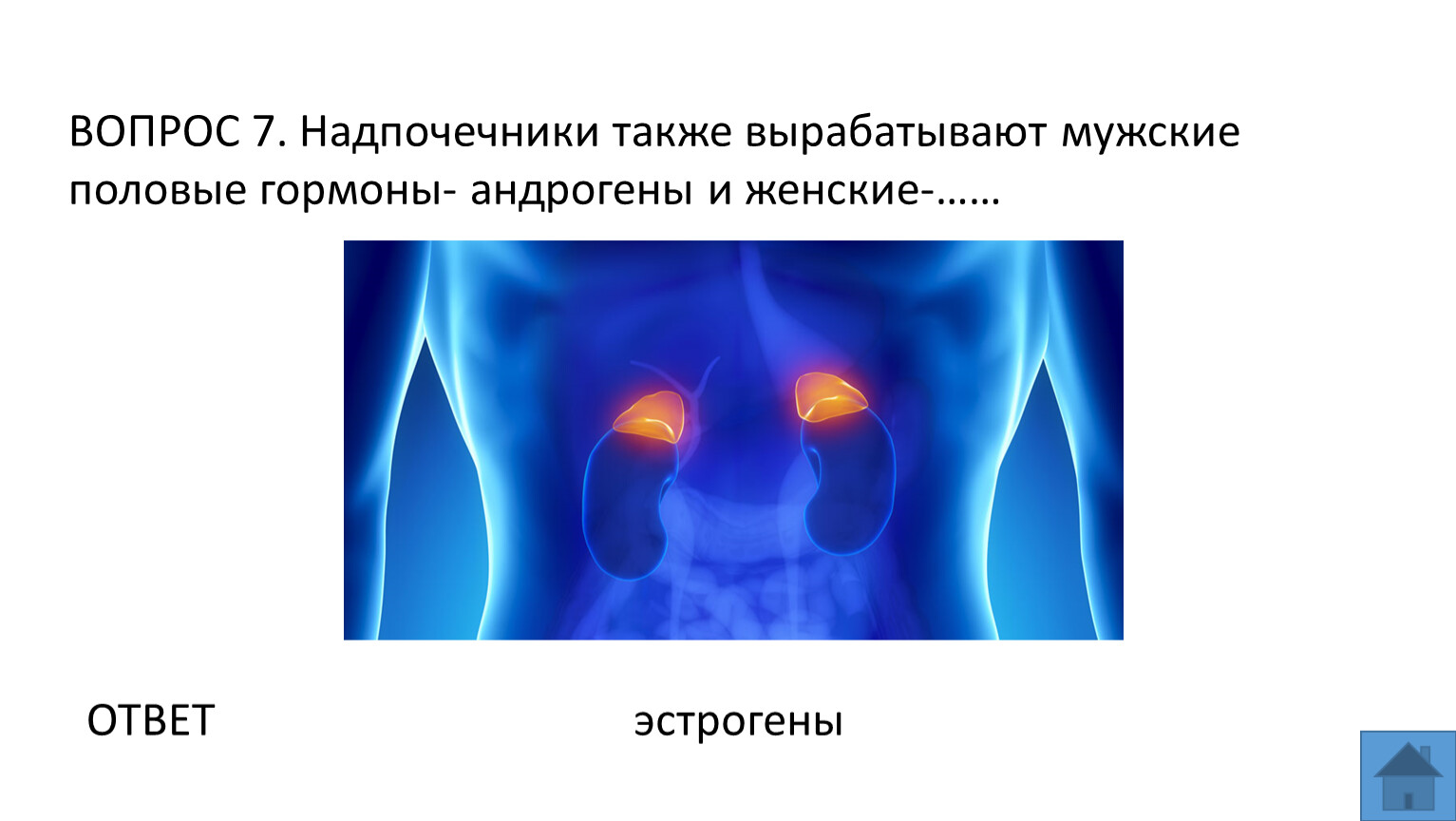 ВОПРОС 7. Надпочечники также вырабатывают мужские половые гормоны- андрогены и женские-……