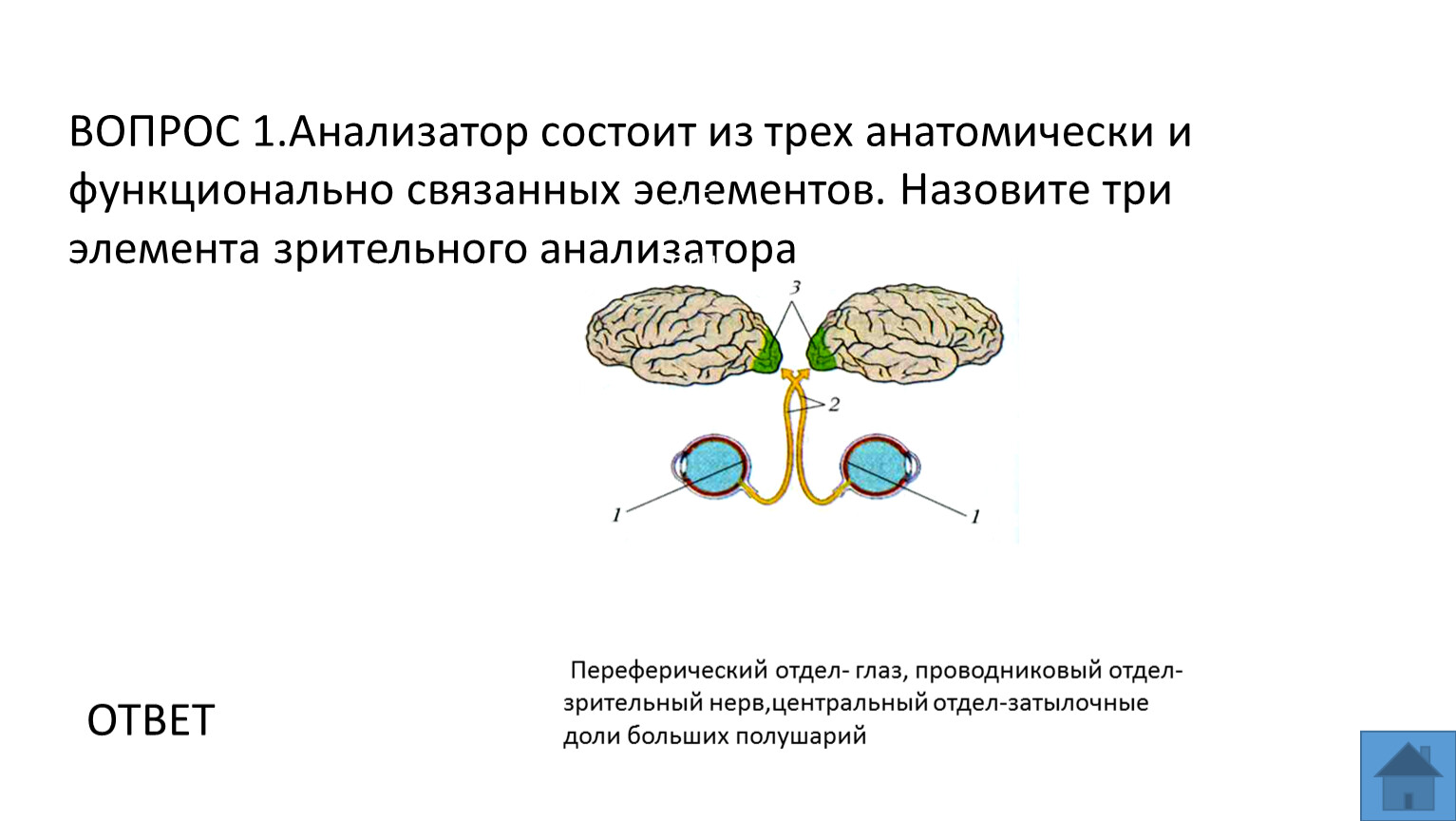 ВОПРОС 1.Анализатор состоит из трех анатомически и функционально связанных эелементов. Назовите три элемента зрительного анализатора