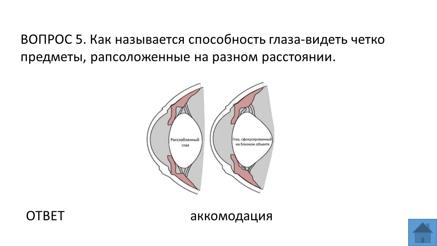 ВОПРОС 5. Как называется способность глаза-видеть четко предметы, рапсоложенные на разном расстоянии.