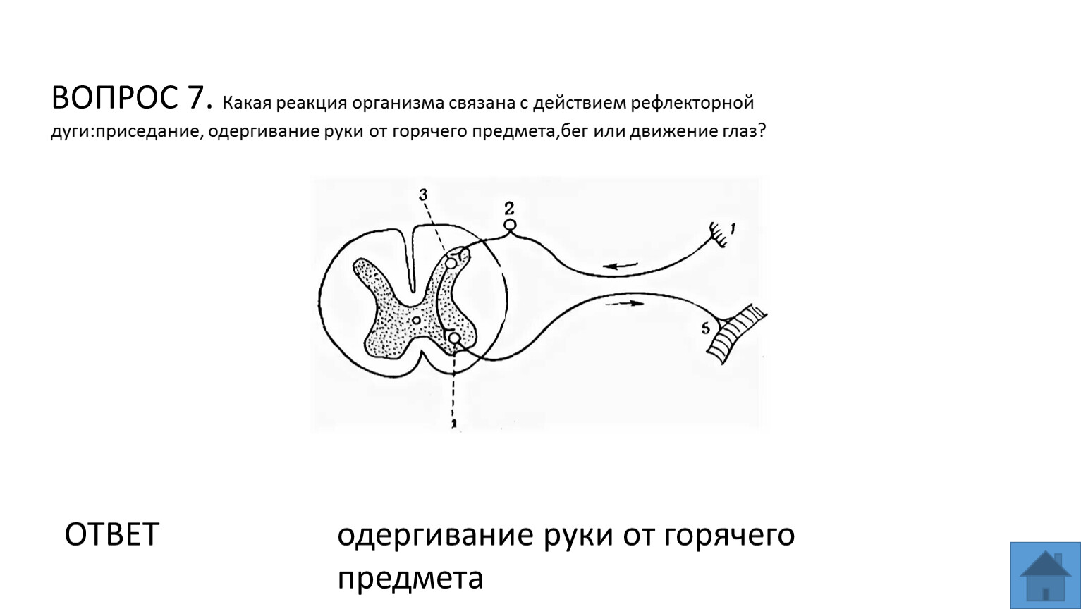 ВОПРОС 7. Какая реакция организма связана с действием рефлекторной дуги:приседание, одергивание руки от горячего предмета,бег или движение глаз?