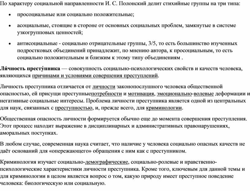 По характеру социальной направленности И. С. Полонский делит стихийные группы на три типа:
