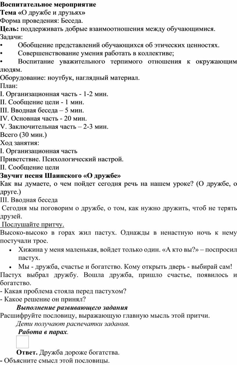 Цель: поддерживать добрые взаимоотношения между обучающимися.