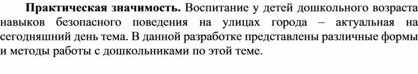 Практическая значимость. Воспитание у детей дошкольного возраста навыков безопасного поведения на улицах города – актуальная на сегодняшний день тема. В данной разработке представлены различные формы и методы работы с дошкольниками по этой теме.