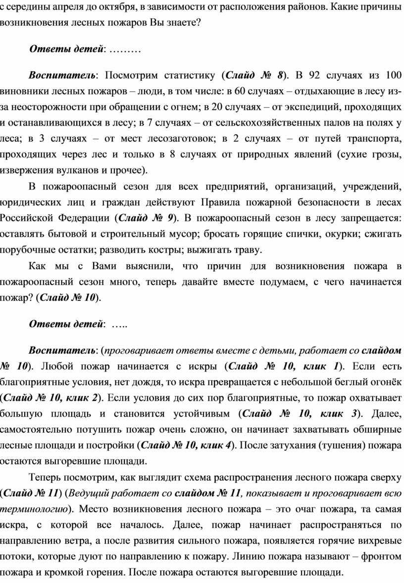 Воспитатель: (проговаривает ответы вместе с детьми, работает со слайдом № 10). Любой пожар начинается с искры (Слайд № 10, клик 1). Если есть благоприятные условия, нет дождя, то искра превращается с небольшой беглый огонёк (Слайд № 10, клик 2). Если условия до сих пор благоприятные, то пожар охватывает большую площадь и становится устойчивым (Слайд № 10, клик 3). Далее, самостоятельно потушить пожар очень сложно, он начинает захватывать обширные лесные площади и постройки (Слайд № 10, клик 4). После затухания (тушения) пожара остаются выгоревшие площади.