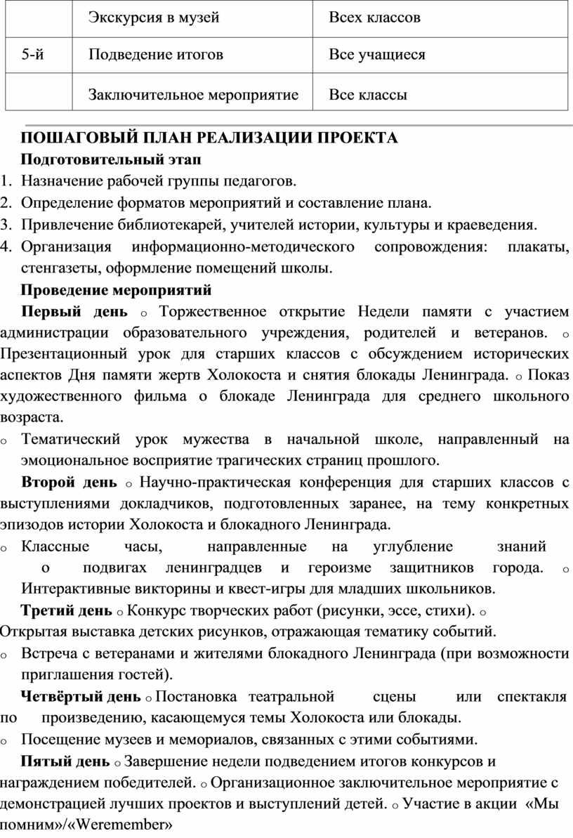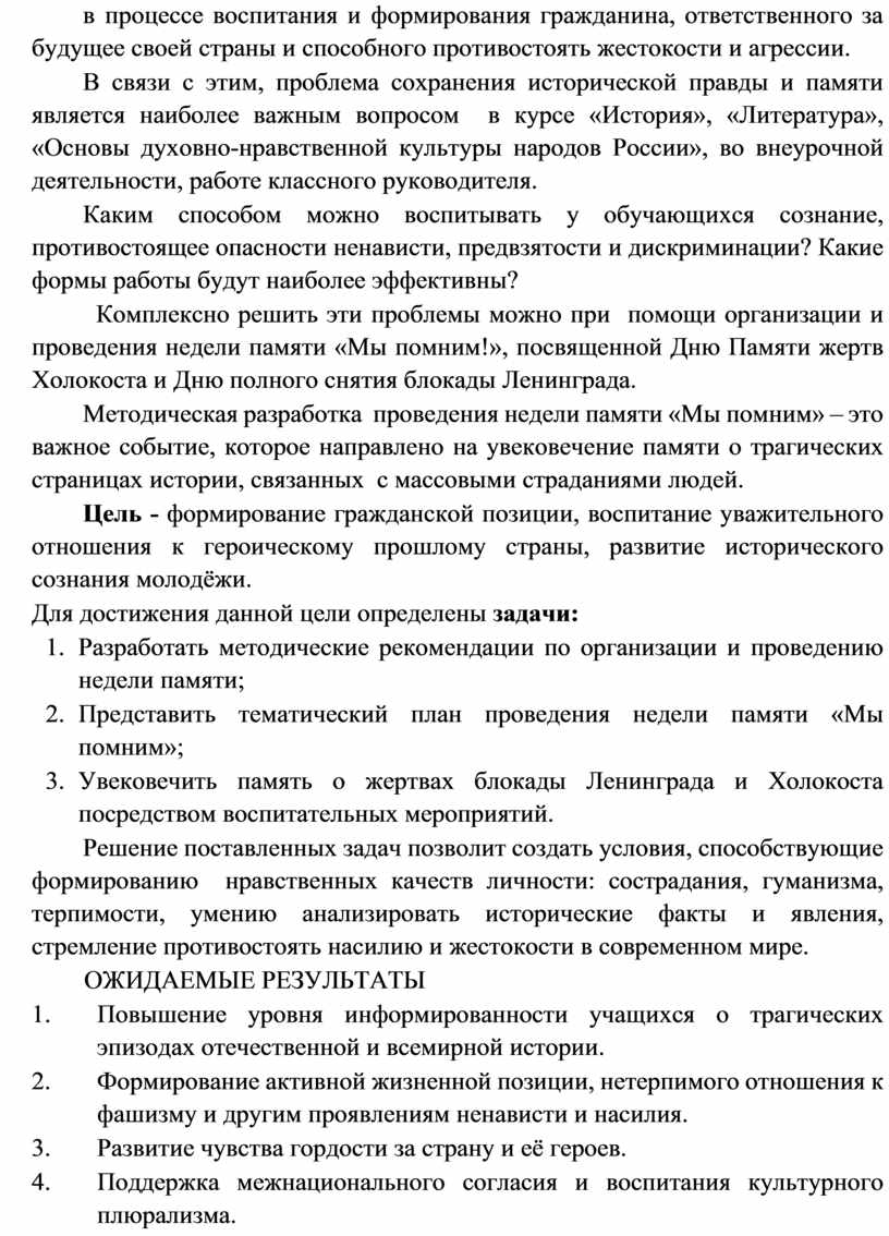 Комплексно решить эти проблемы можно при помощи организации и проведения недели памяти «Мы помним!», посвященной Дню Памяти жертв Холокоста и Дню полного снятия блокады Ленинграда.