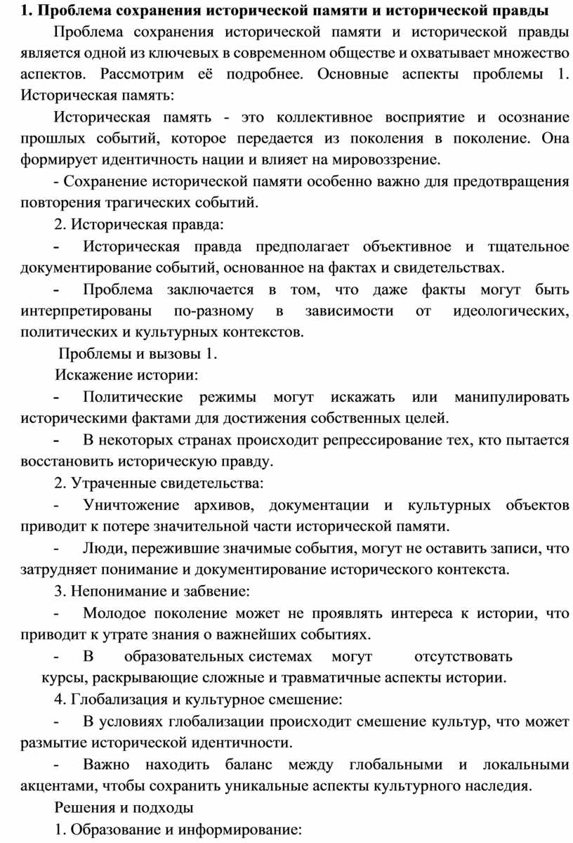 Проблема сохранения исторической памяти и исторической правды является одной из ключевых в современном обществе и охватывает множество аспектов. Рассмотрим её подробнее. Основные аспекты проблемы 1. Историческая память: