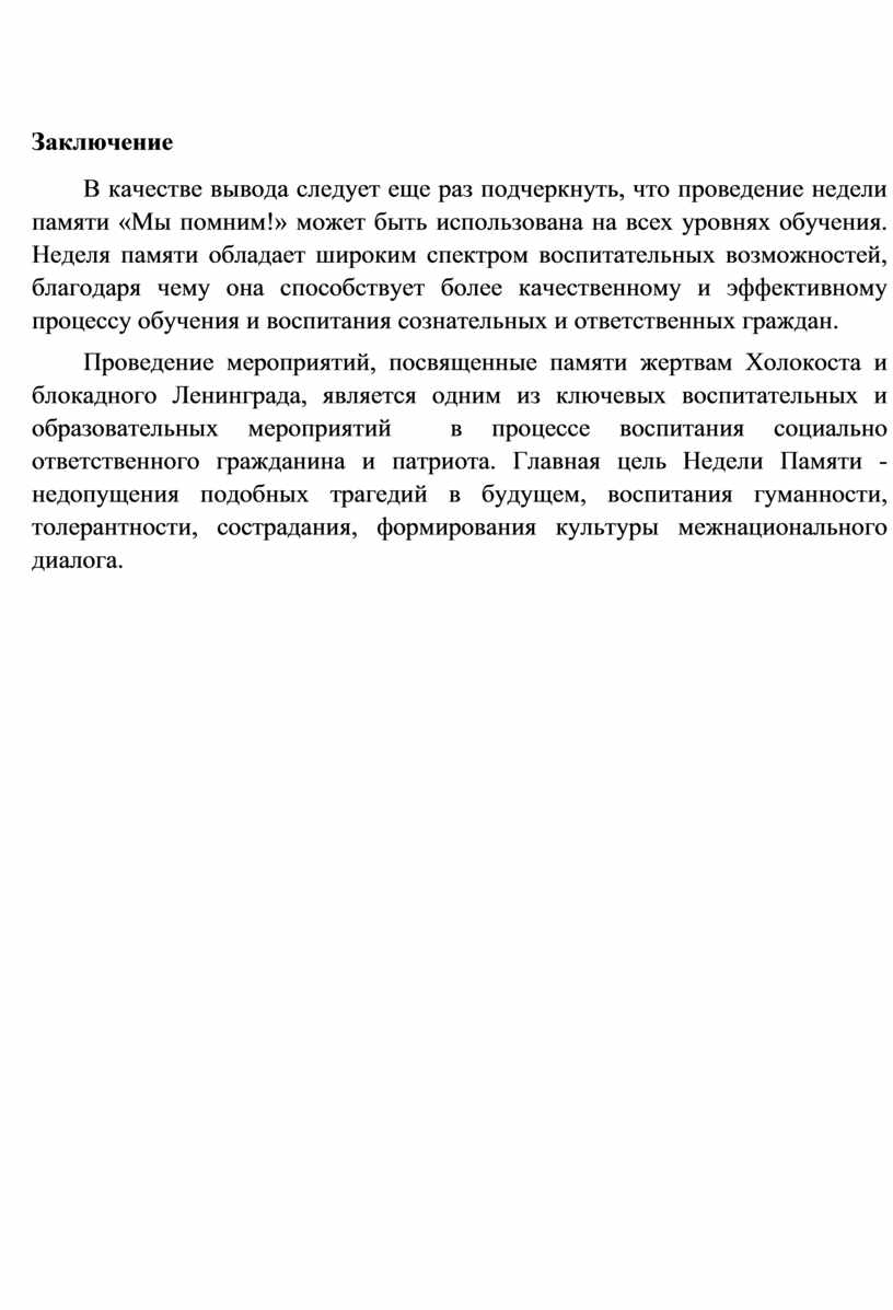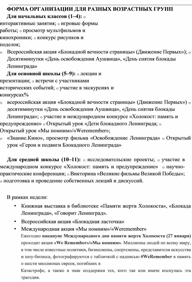 В реализации проведения мероприятий недели памяти, необходимо тщательно продумать формы, условия, организацию работы по приобщению школьников к этой сложной теме, поскольку любое морализаторство или же формальный, поверхностный подход ко Дню памяти жертв Холокоста и Дню полного снятия блокады Ленинграда может вызвать лишь отторжение и привести к искаженному пониманию этой трагедии. Поэтому так важны деликатность, взвешенность, серьезная подготовка при организации уроков, тематических занятий, воспитательных мероприятий на эту тему.