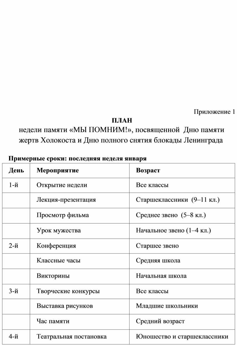 План проведения недели памяти носит вариативный характер и может изменяться с учетом потребностей и возможностей конкретного класса и конкретной школы.