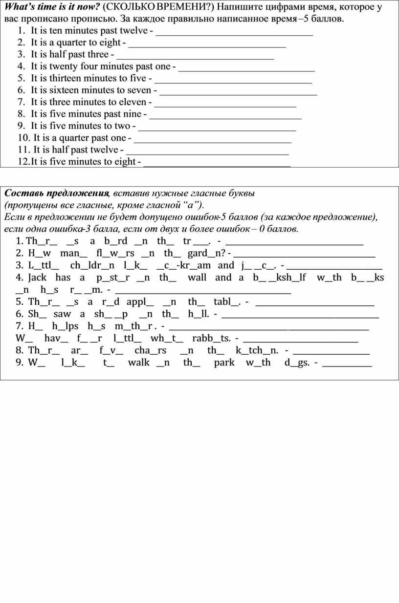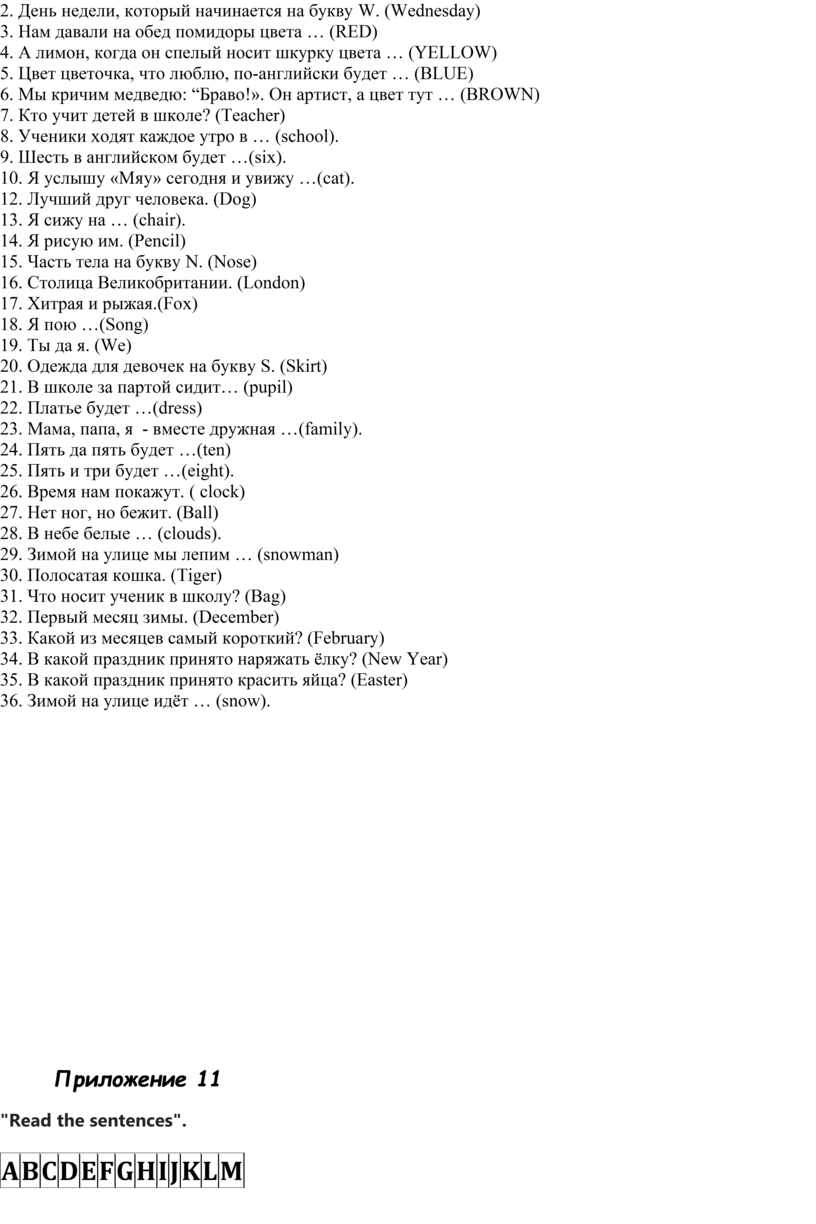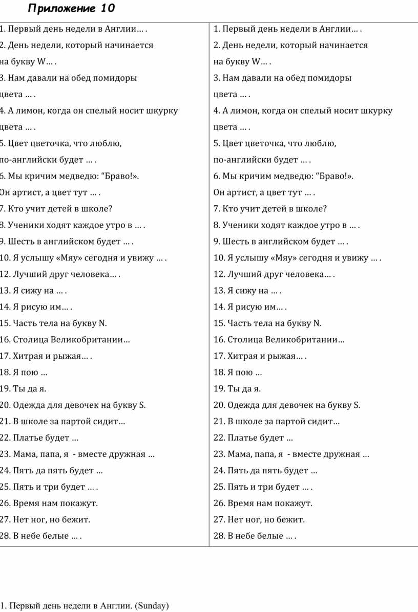 1. Первый день недели в Англии… . 2. День недели, который начинается на букву W… . 3. Нам давали на обед помидоры цвета … . 4. А лимон, когда он спелый носит шкурку цвета … . 5. Цвет цветочка, что люблю, по-английски будет … . 6. Мы кричим медведю: “Браво!». Он артист, а цвет тут … . 7. Кто учит детей в школе? 8. Ученики ходят каждое утро в … . 9. Шесть в английском будет … . 10. Я услышу «Мяу» сегодня и увижу … . 12. Лучший друг человека… . 13. Я сижу на … . 14. Я рисую им… . 15. Часть тела на букву N. 16. Столица Великобритании… 17. Хитрая и рыжая… . 18. Я пою … 19. Ты да я. 20. Одежда для девочек на букву S. 21. В школе за партой сидит… 22. Платье будет … 23. Мама, папа, я - вместе дружная … 24. Пять да пять будет … 25. Пять и три будет … . 26. Время нам покажут. 27. Нет ног, но бежит. 28. В небе белые … . |