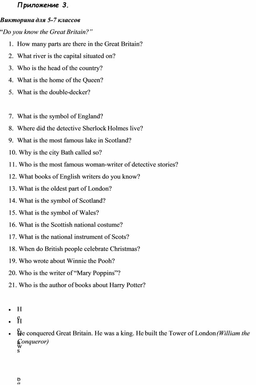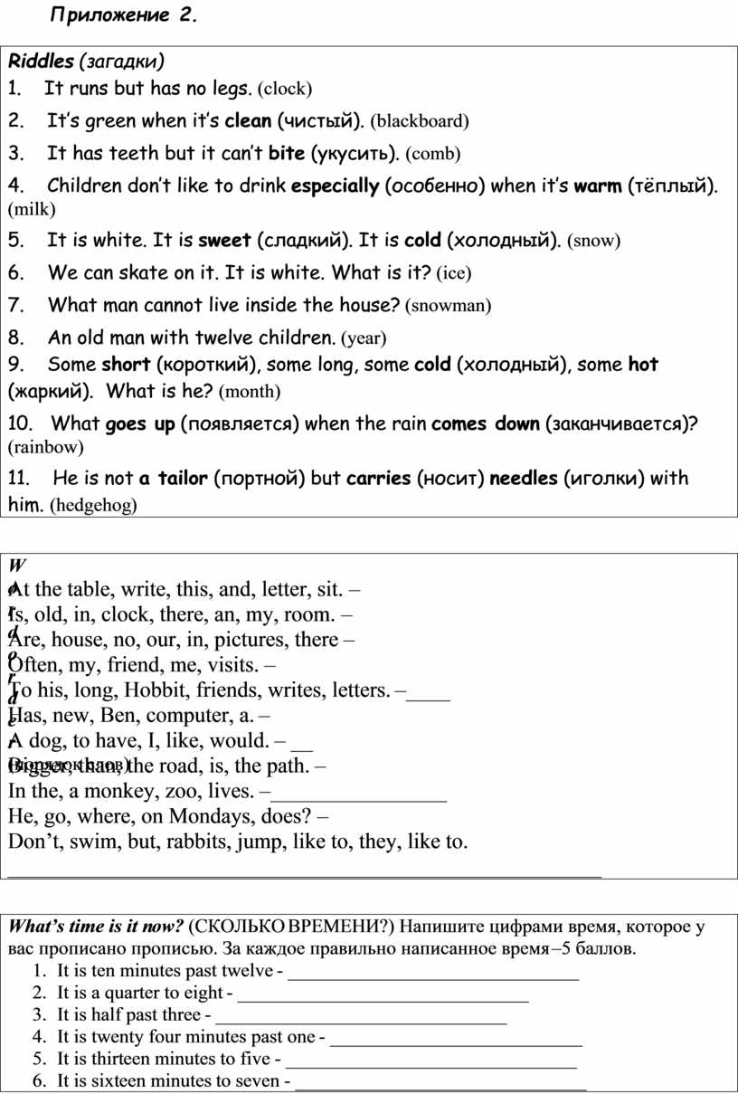 1) отгадывают загадки; 2) расставляют слова в предложении по порядку; 3) определяют, сколько времени. Приложение 2 4) отвечают на вопросы викторины «Хорошо ли ты знаешь Великобританию?», |