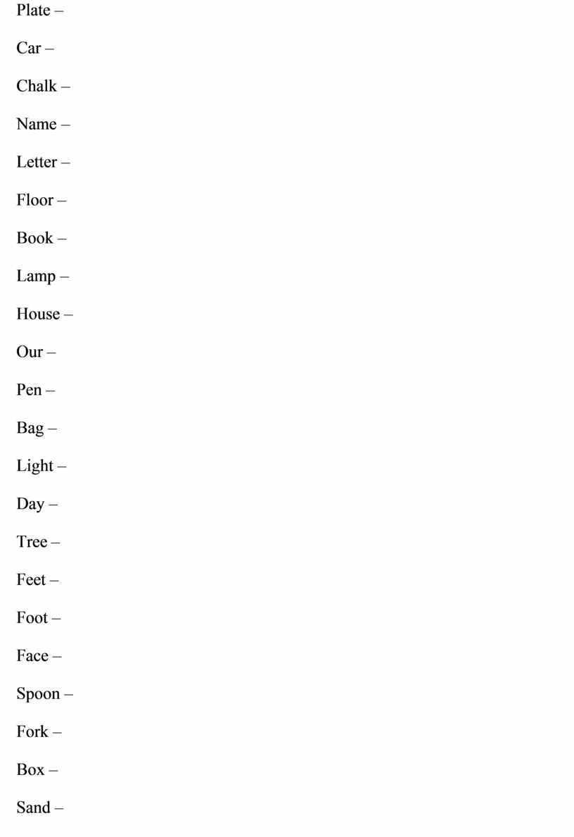 Cat - Plate – Car – Chalk – Name – Letter – Floor – Book – Lamp – House – Our – Pen – Bag – Light – Day – Tree – Feet – Foot – Face – Spoon – Fork – Box – Sand – Stick – Street – Fish – |