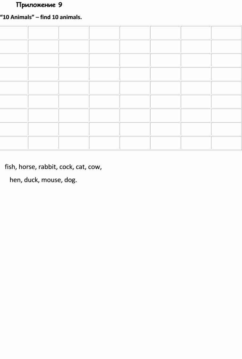 1) Разминка: «Matching exercise» - соединить слово и его транскрипцию. Приложение 8 2) «Find the word» - найти слово в поле для букв. Слова по теме «Животные» Приложение 9 3) Конкурс чтецов на английском языке. |