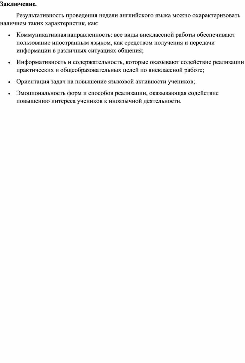 Участвуя в различных конкурсах, школьники демонстрируют свое знание иностранного языка. В процессе проведения недели используется познавательный, развивающий материал, разнообразные приемы, формы, методы. Вырабатывается ответственность учащихся за добровольно взятые на себя поручения. Массовый охват учащихся разными мероприятиями повышает интерес к изучению английского языка, появляется мотивация к практическому владению разными видами речевой деятельности, увеличивается активный запас учащихся, совершенствуется произношение, стимулируется интеллектуальная и языковая активность, что приводит к общему повышению культурного уровня учащихся.