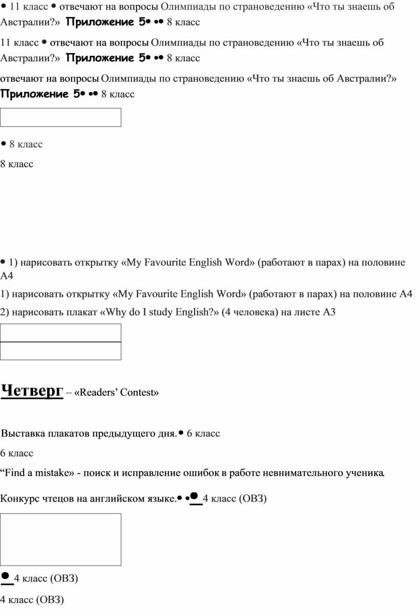 1) “Find a mistake» - поиск и исправление ошибок в работе невнимательного ученика. 2) Конкурс чтецов на английском языке. |