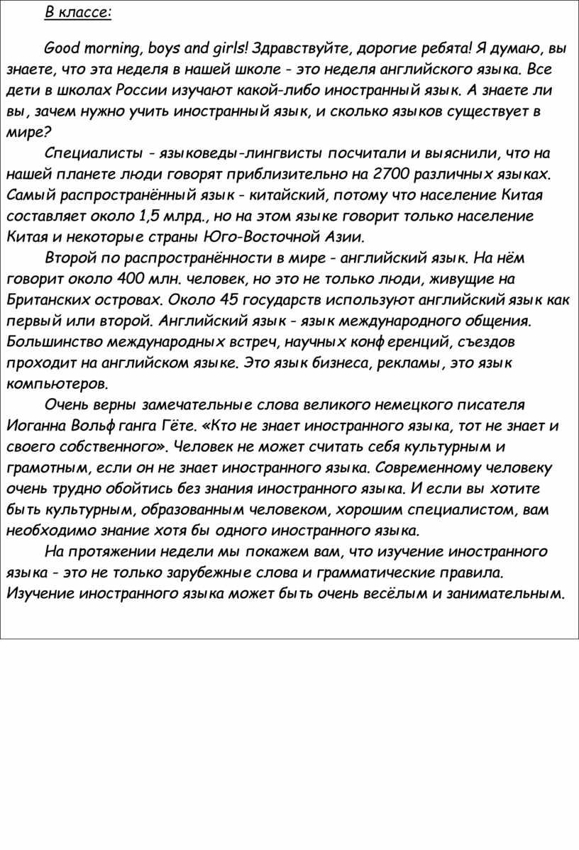 На линейке: Приветствие на английском, объявление темы недели (1-2 минуты).