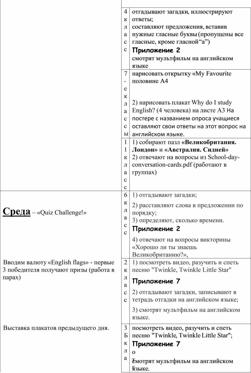 1) собирают пазл «Великобритания. Лондон» и «Австралия. Сидней» 2) отвечают на вопросы из School-day-conversation-cards.pdf (работают в группах) |