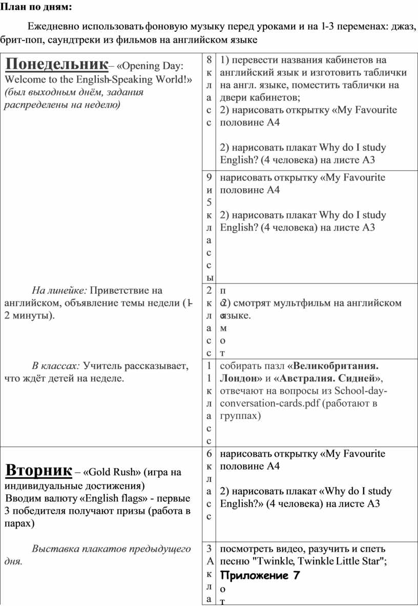 · Неделя английского языка была распланирована таким образом, чтобы были охвачены все ступени обучения. Кроме того, учитывались интересы учащихся при подготовке сценария недели, где бы они могли полностью творчески раскрыться. Настроение праздника, языковая атмосфера создавались при помощи музыки, красочно оформленными стенгазетами о странах, городах, праздниках и традициях стран изучаемого языка, просмотром видеофильмов на английском языке.