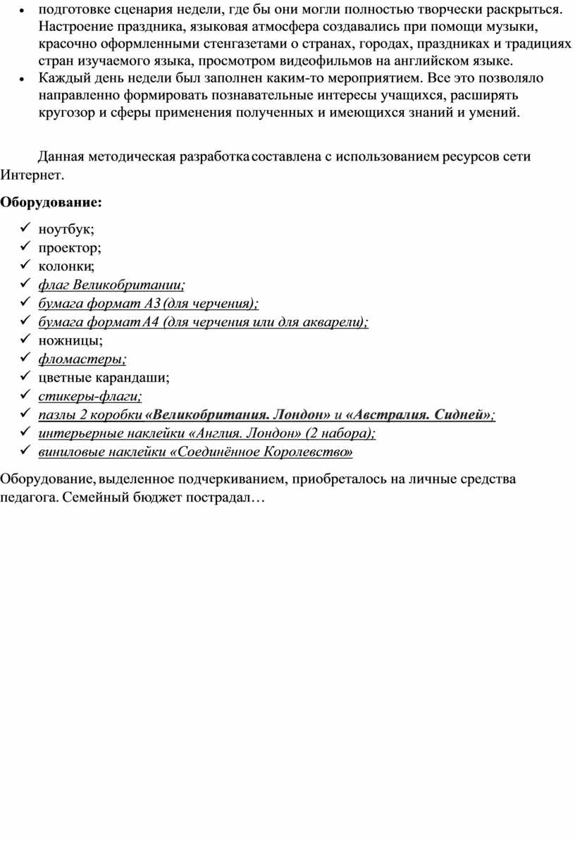Оборудование, выделенное подчеркиванием, приобреталось на личные средства педагога. Семейный бюджет пострадал…