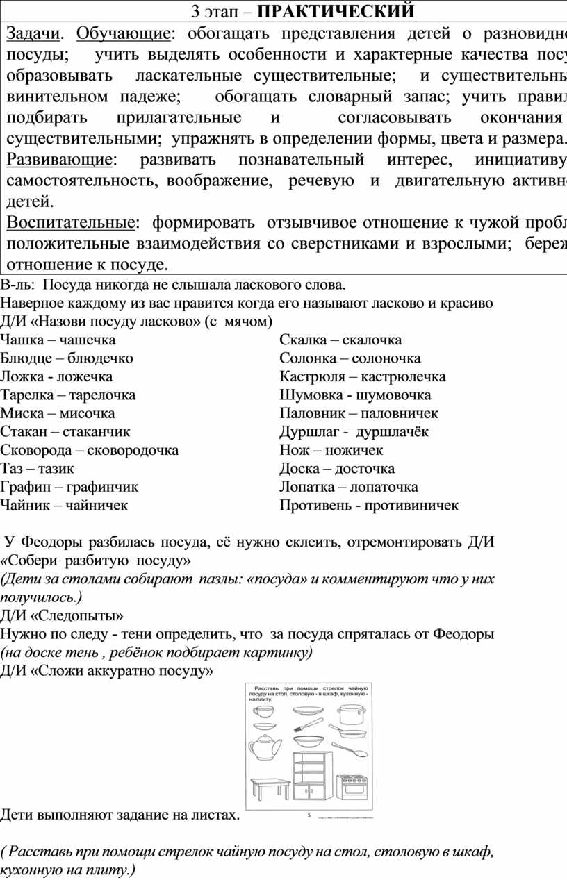 Д/Игры: Д/И «Назови посуду ласково» (с мячом), «Собери разбитую посуду», Д/И «Следопыты», Д/И «Сложи аккуратно посуду»,