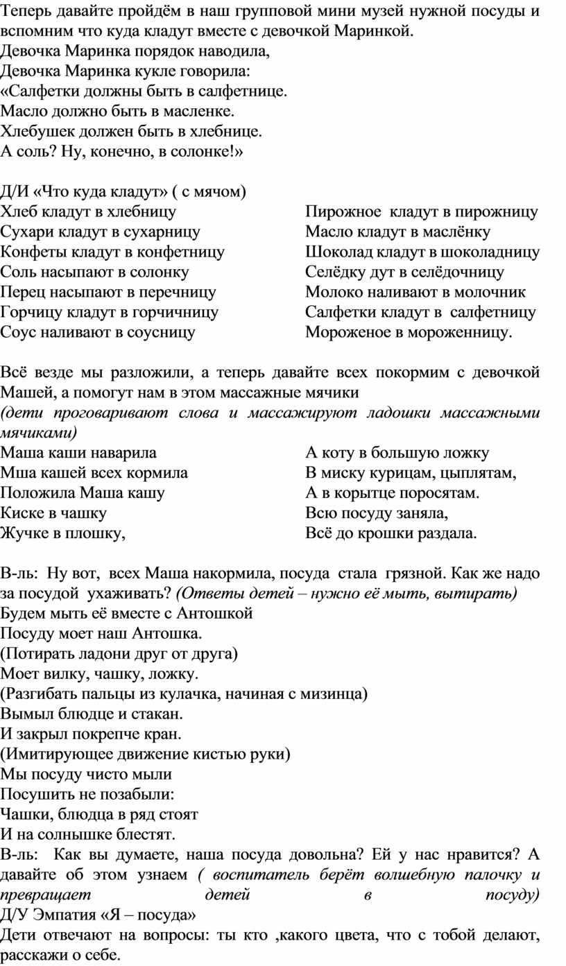Теперь давайте пройдём в наш групповой мини музей нужной посуды и вспомним что куда кладут вместе с девочкой Маринкой.