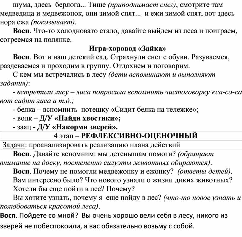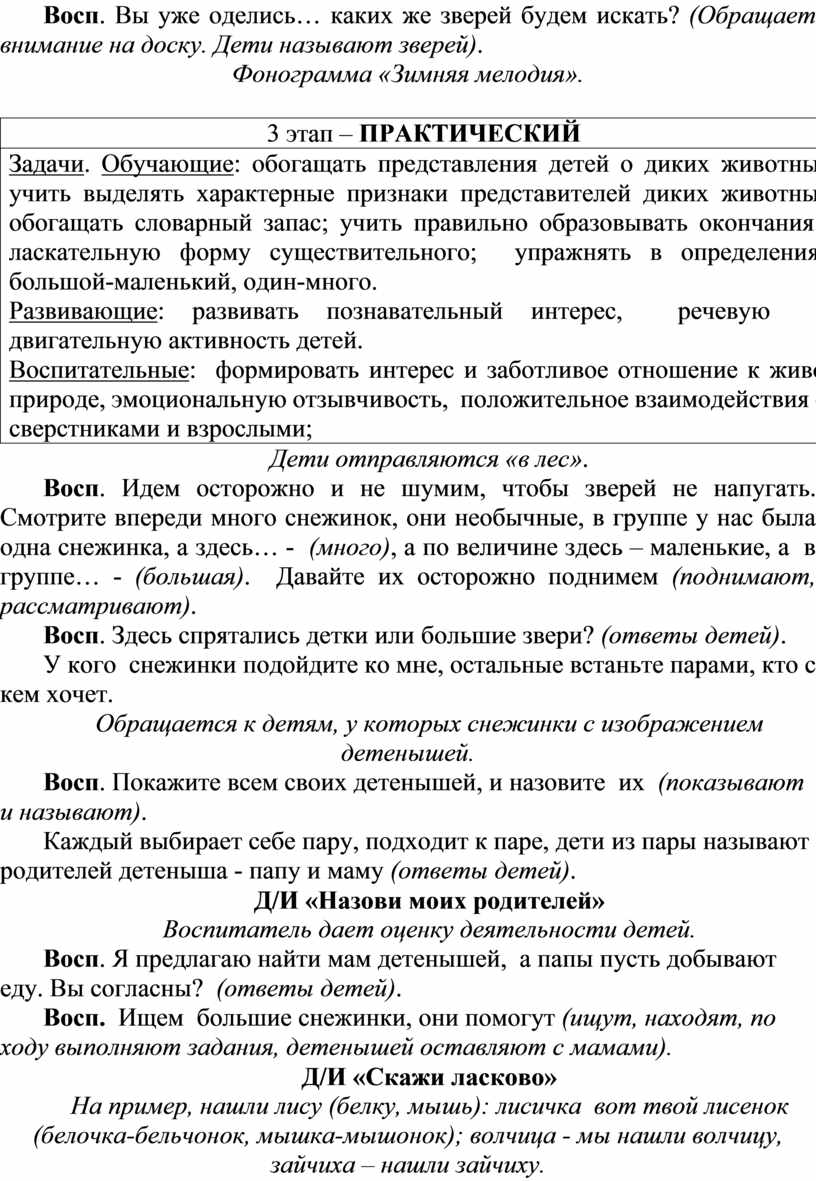 Восп. Ребята, что случилось? Опять сильный ветер налетел и завыл. Посмотрите, за окном ни одной снежинки не осталось (дети смотрят в окно). Ой, а куда же делись наши звери? (предположения детей, дальнейшие действия зависят от предположений).