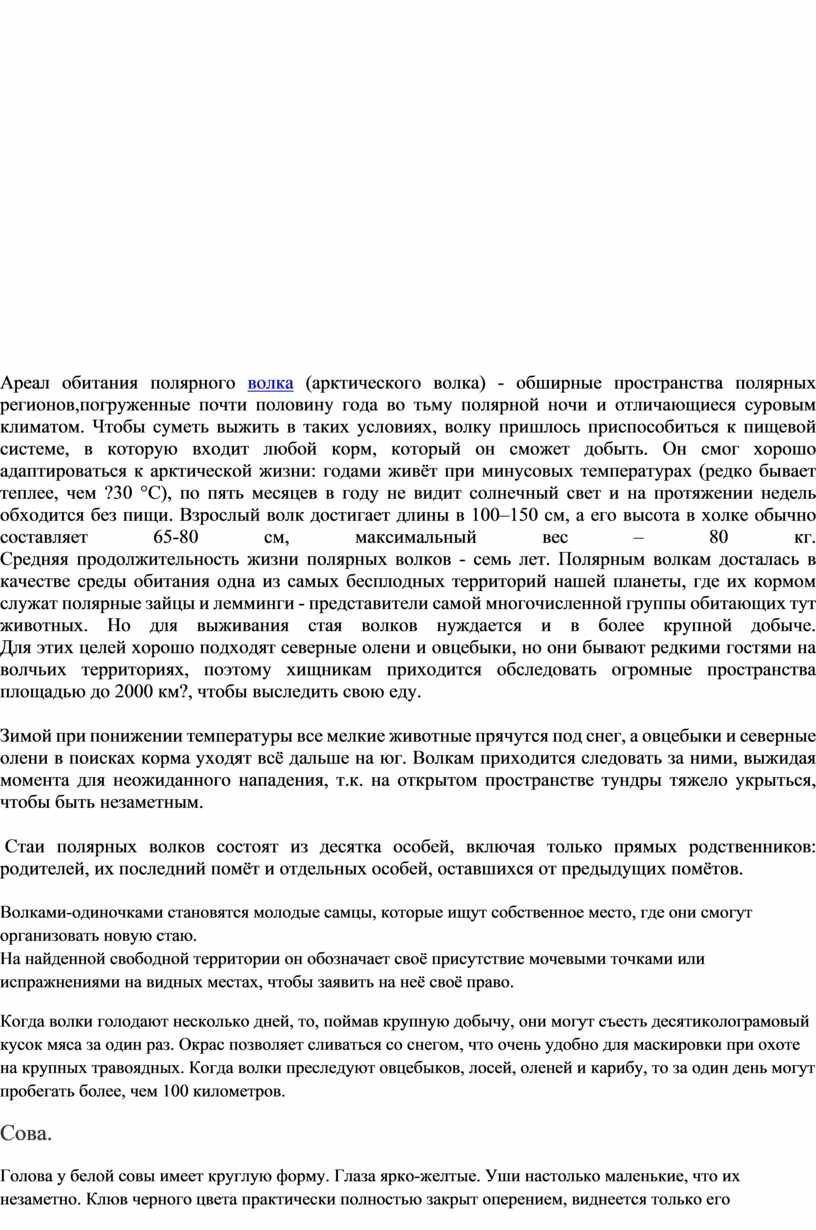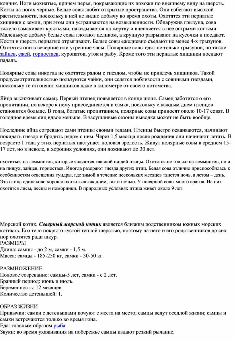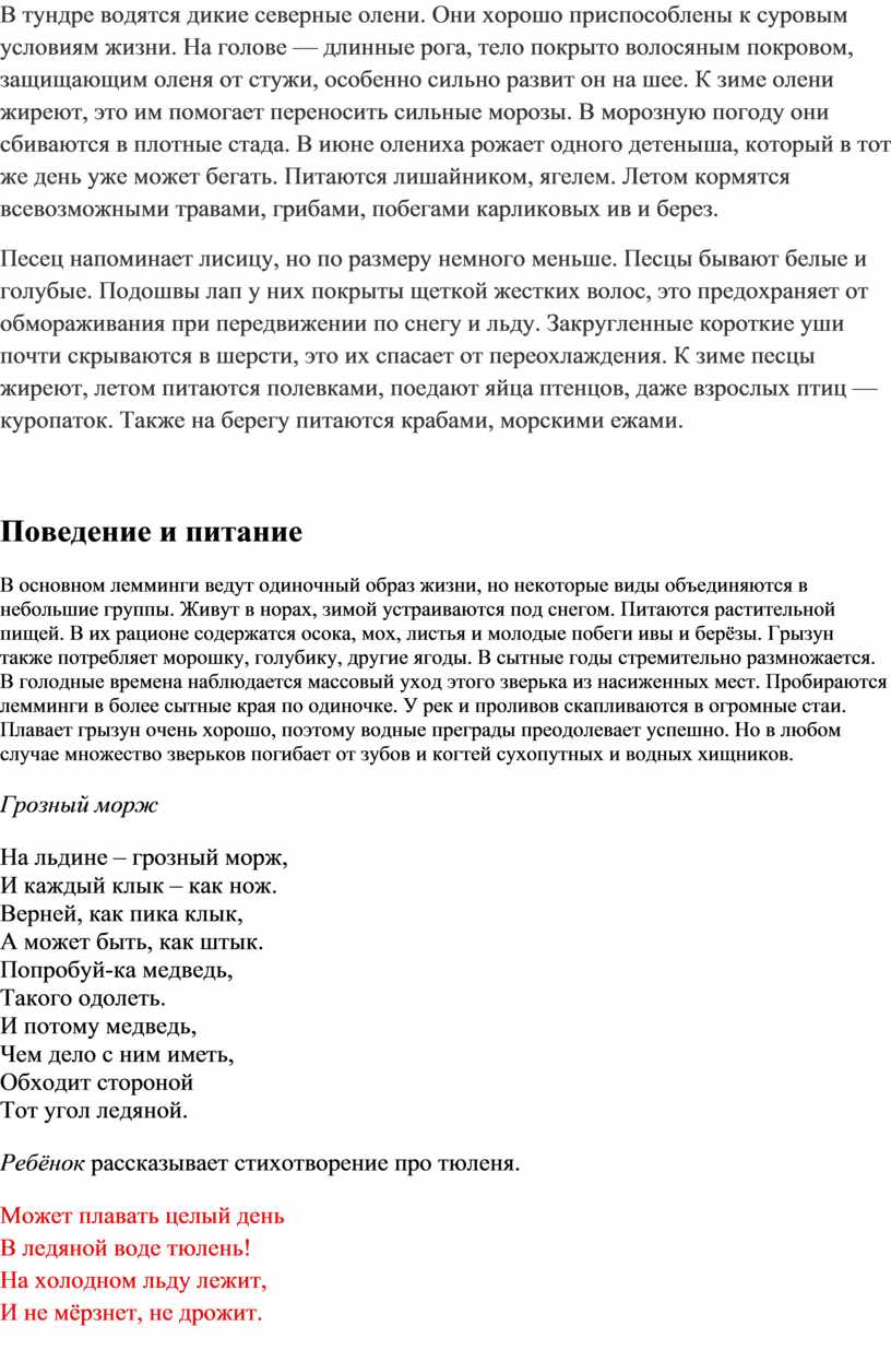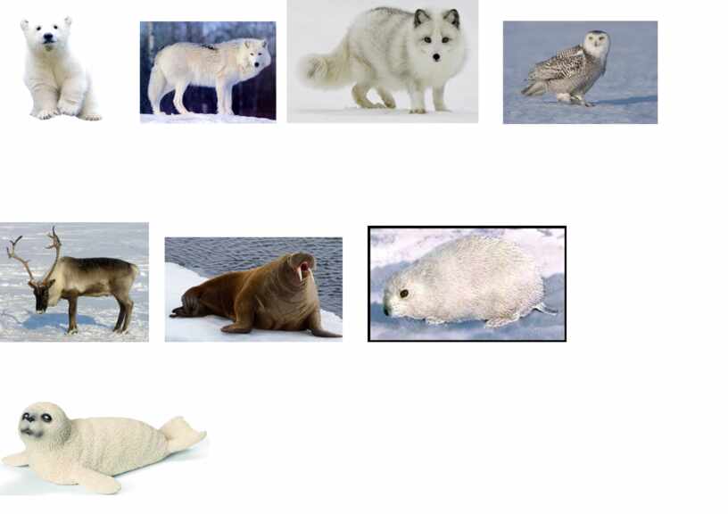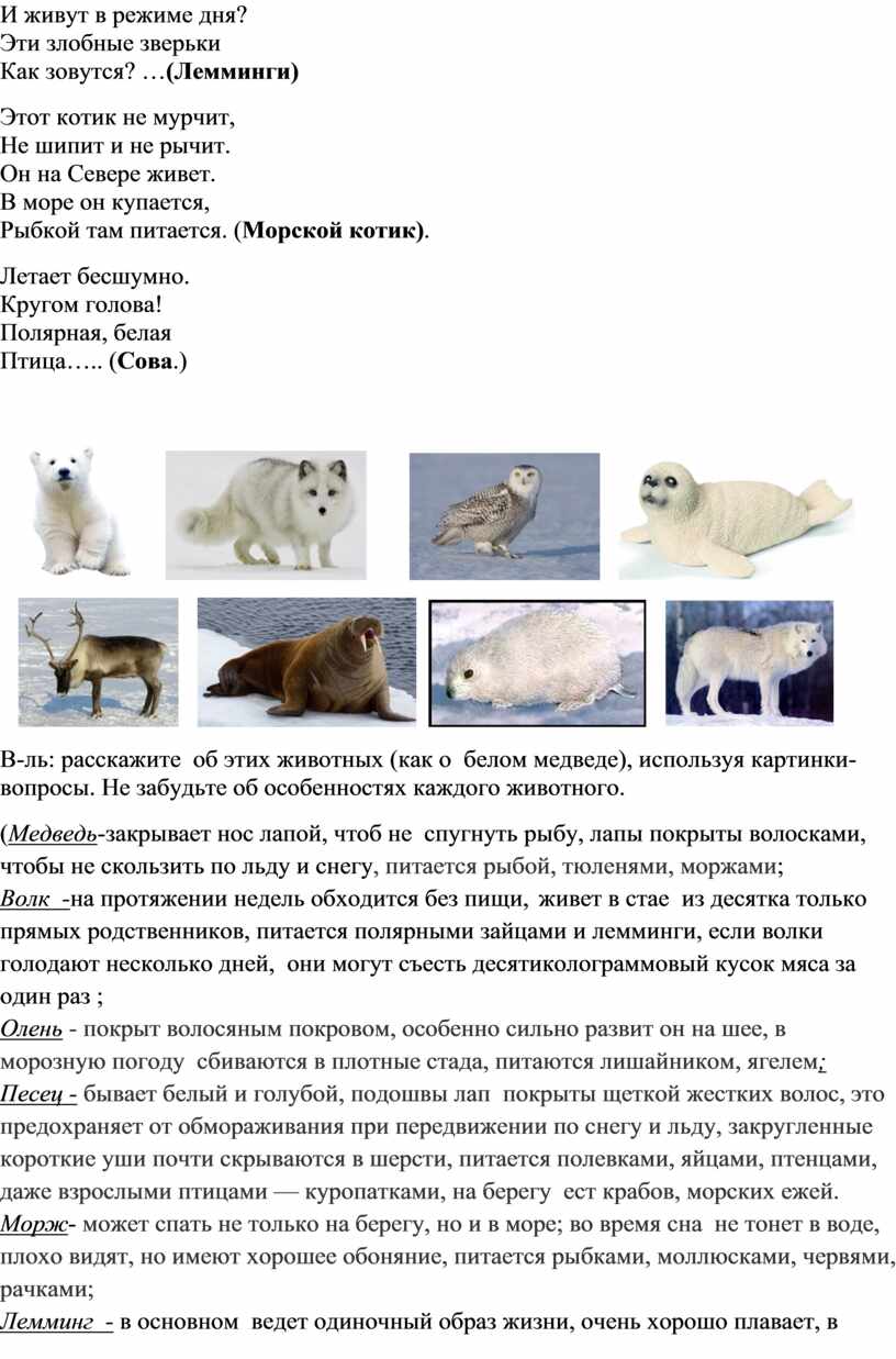 (Медведь-закрывает нос лапой, чтоб не спугнуть рыбу, лапы покрыты волосками, чтобы не скользить по льду и снегу, питается рыбой, тюленями, моржами; Волк -на протяжении недель обходится без пищи, живет в стае из десятка только прямых родственников, питается полярными зайцами и лемминги, если волки голодают несколько дней, они могут съесть десятиколограммовый кусок мяса за один раз ; Олень - покрыт волосяным покровом, особенно сильно развит он на шее, в морозную погоду сбиваются в плотные стада, питаются лишайником, ягелем; Песец - бывает белый и голубой, подошвы лап покрыты щеткой жестких волос, это предохраняет от обмораживания при передвижении по снегу и льду, закругленные короткие уши почти скрываются в шерсти, питается полевками, яйцами, птенцами, даже взрослыми птицами — куропатками, на берегу ест крабов, морских ежей. Морж- может спать не только на берегу, но и в море; во время сна не тонет в воде, плохо видят, но имеют хорошее обоняние, питается рыбками, моллюсками, червями, рачками; Лемминг - в основном ведет одиночный образ жизни, очень хорошо плавает, в голодные времена наблюдается массовый уход этого зверька из насиженных мест, питаются растительной пищей (осока, мох, листья и молодые побеги ивы и берёзы); Сова-видит одинаково хорошо днем и ночью, питаются грызунами, охотится далеко от гнезда, яйца высиживает самец, зайцами, ежами, горностаями, куропатками, утками и рыбой; Котик- самки с детенышами кочуют с места на место, самцы ведут оседлой жизни, могут нырять на глубину до 200 метров, половину своей жизни проводят в холодной воде, их называют ушастыми тюленями, пытается рыбой).