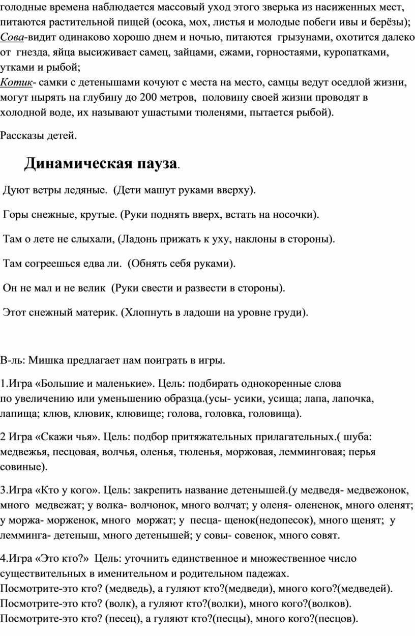3.Игра «Кто у кого». Цель: закрепить название детенышей.(у медведя- медвежонок, много медвежат; у волка- волчонок, много волчат; у оленя- олененок, много оленят; у моржа- морженок, много моржат; у песца- щенок(недопесок), много щенят; у лемминга- детеныш, много детенышей; у совы- совенок, много совят.