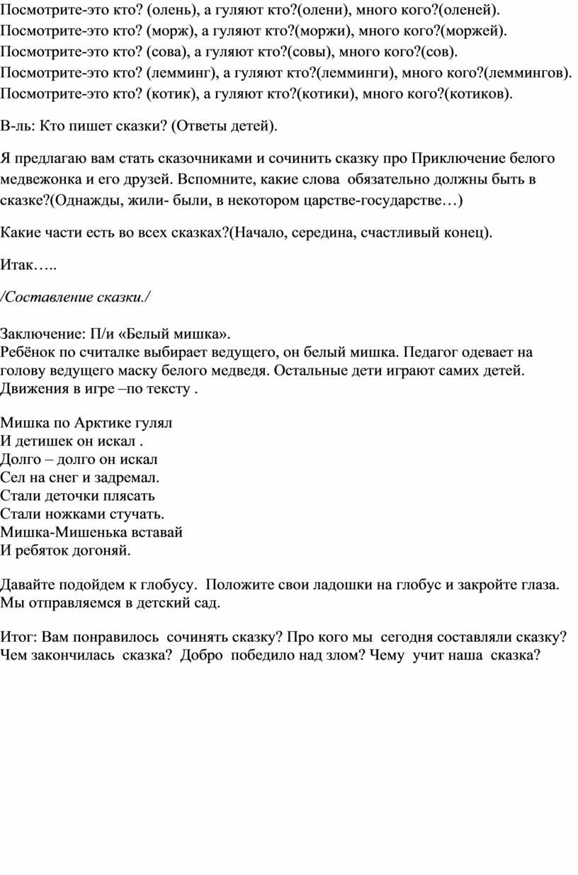 Заключение: П/и «Белый мишка». Ребёнок по считалке выбирает ведущего, он белый мишка. Педагог одевает на голову ведущего маску белого медведя. Остальные дети играют самих детей. Движения в игре –по тексту .